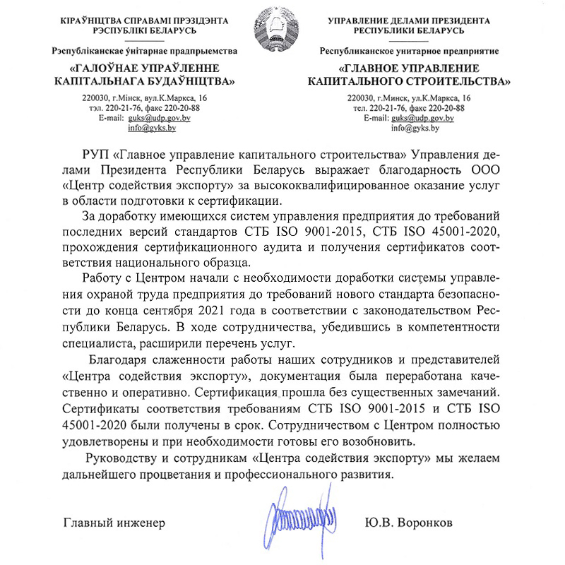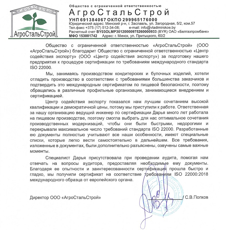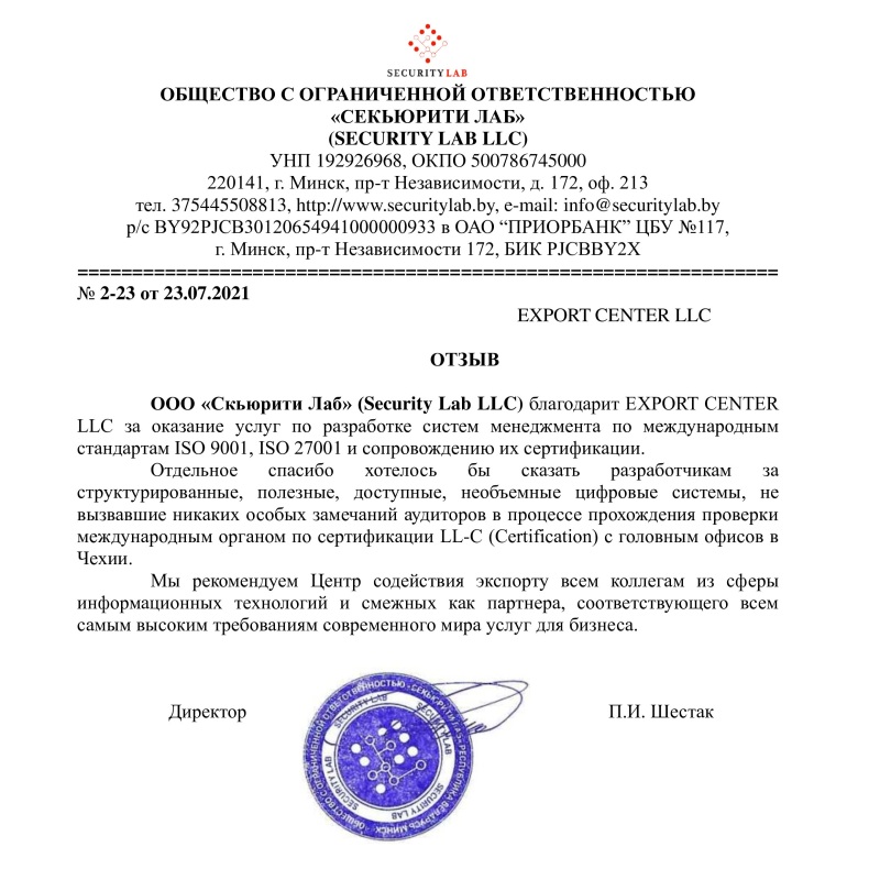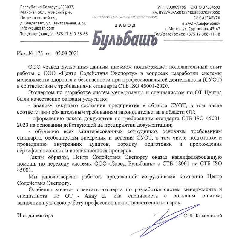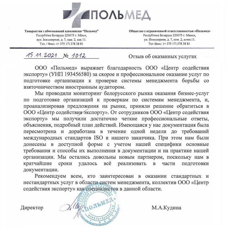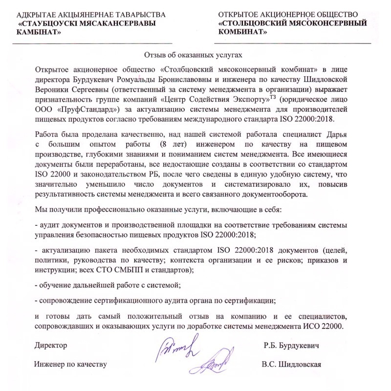 — Подготовка к сертификации в РБ (СТБ ИСО) и зарубежье любых предприятий;