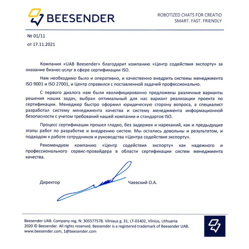 Мы объединили опытных разработчиков, аудиторов, международные органы и получили профессиональный центр по сопровождению сертификации. Мы гарантируем качественную и оперативную реализацию услуг по системам качества, ведь наш опыт охватывает не только все отрасли экономики, но и все страны. Все наши клиенты из Беларуси, России, Эстонии, Великобритании и других стран получили необходимые сертификаты, и мы со своей стороны гарантируем результат для новых компаний.