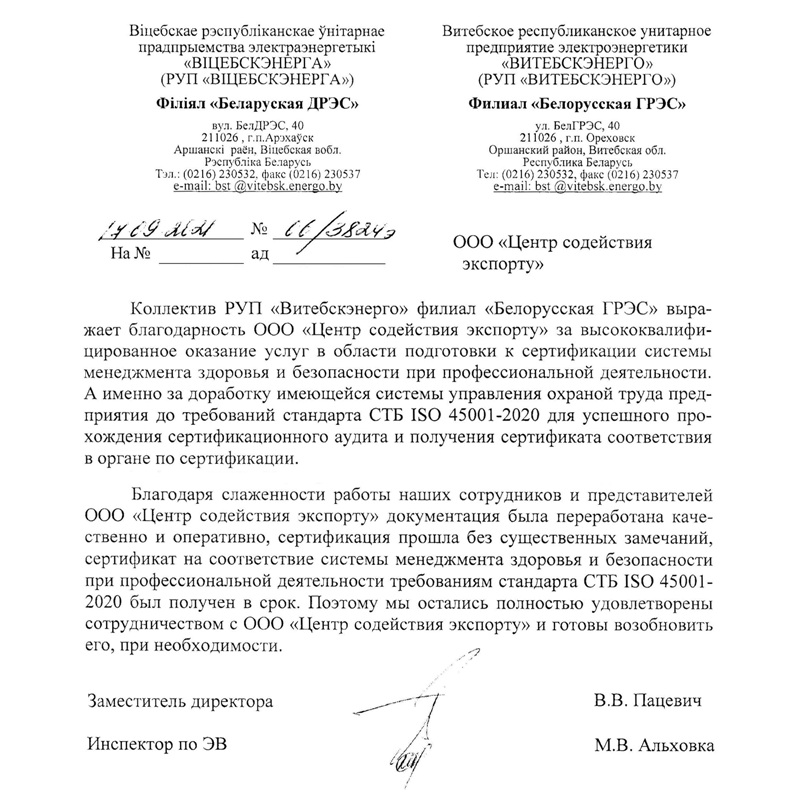Мы разрабатываем систему менеджмента СТБ ИСО 45001 2020 и внедряем ее. Сертификацию проводит белорусский аккредитованный орган (их несколько, на выбор), а мы осуществляем сопровождение проверки соответствия как представитель Вашей компании. По окончанию инспектирования после устранения замечаний, выявленных в процессе, Вы становитесь обладателем сертификата соответствия, который вносится в гос. реестр tsouz.belgiss.by.
