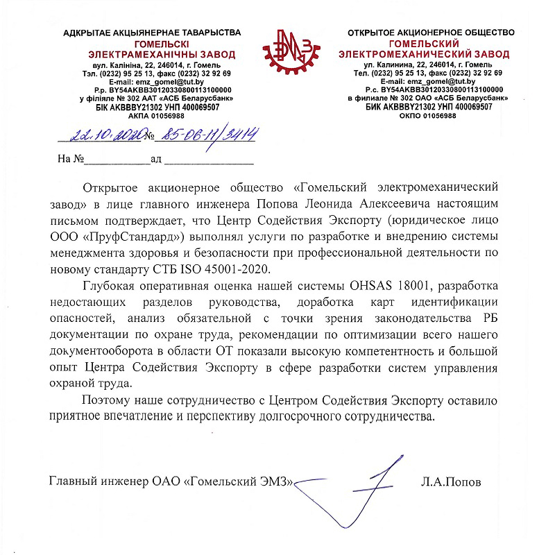 Мы занимаемся разработкой, внедрением и сертификацией как по международной ISO 45001:2018, так и национальной схеме - СТБ ISO 45001-2020: от полного комплекса услуг до написания или проверки отдельных документов.