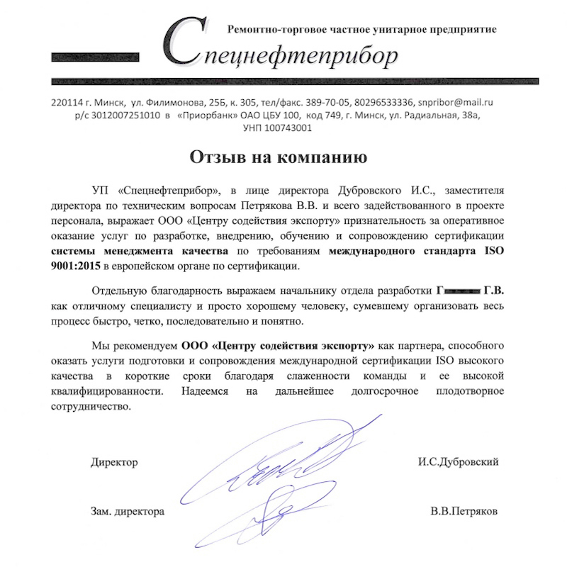 Мы разрабатываем систему менеджмента качества СТБ ISO 9001-2015 и внедряем ее. Аудит проводится согласно требованиям белорусского стандарта с занесением в государственный реестр tsouz.belgiss.by, что в свою очередь является гарантией его принятия всеми государственными инстанциями в РБ.